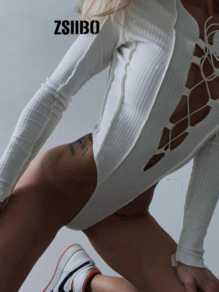 Y2k Women Ribbed Knitted Long Sleeve Tie Up Sexy Bodysuit Bandage Patchwork Bodycon Club Party Body Outfit  Waist jumpsuit Top
